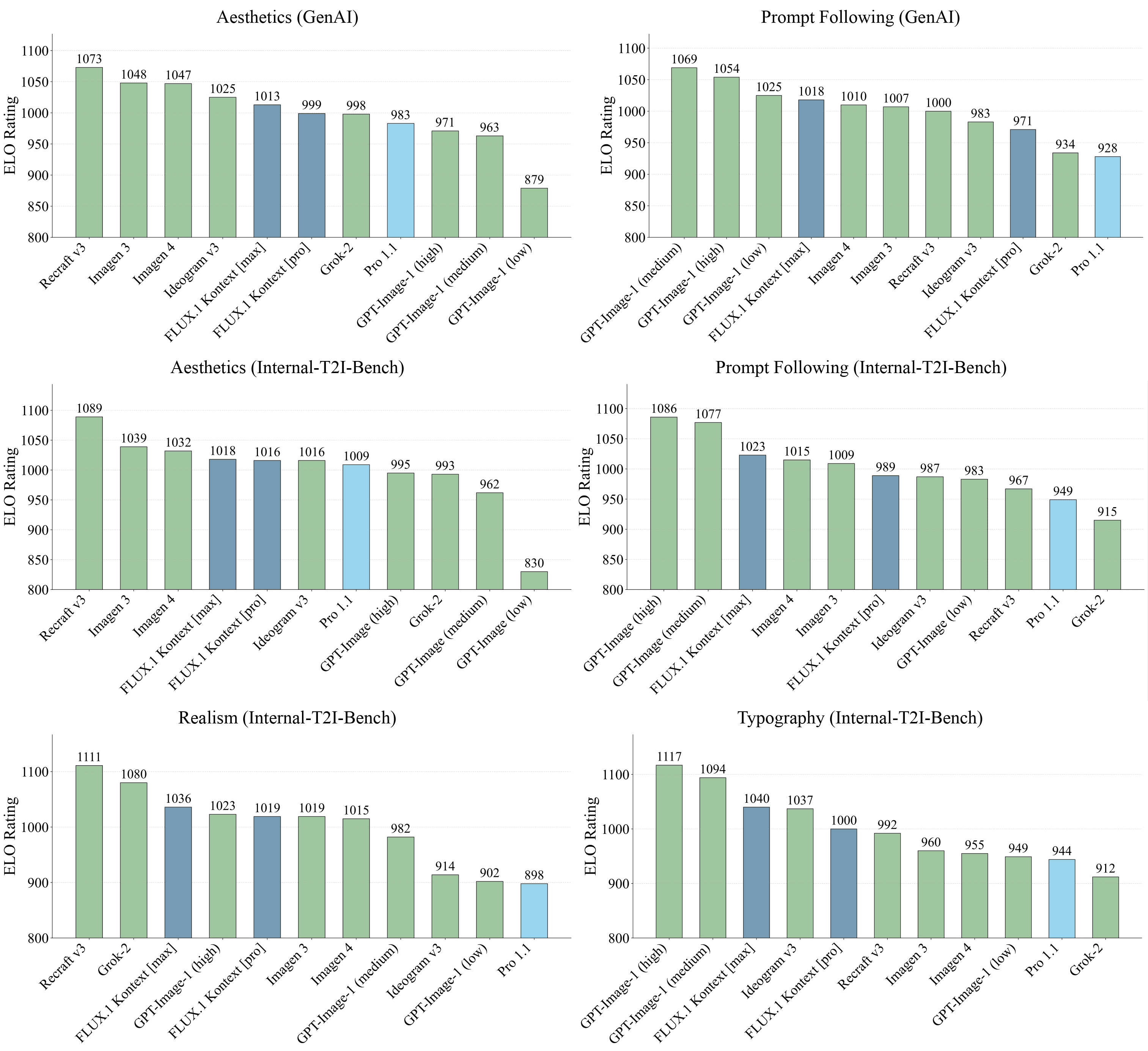 We evaluate FLUX.1 Kontext on text-to-image benchmarks across multiple quality dimensions. FLUX.1 Kontext models demonstrate competitive performance across aesthetics, prompt following, typography, and realism benchmarks.