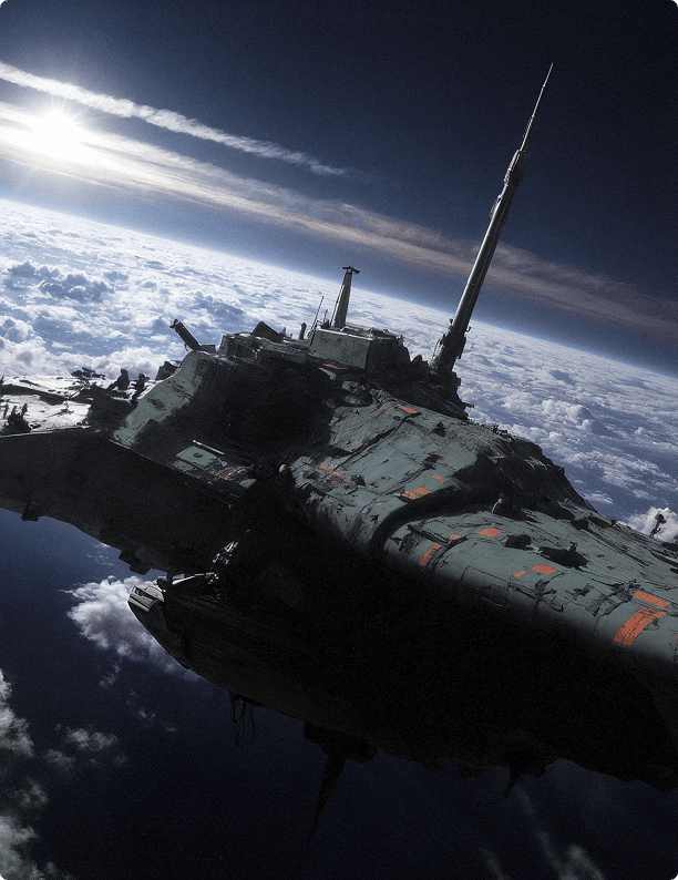 Surreal Sci-fi style photography of spaceship orbiting high above a cloud-covered planet with sunlight casting dramatic shadows. The ship is rugged, industrial, and weathered. Realistic lighting, cinematic perspective.
